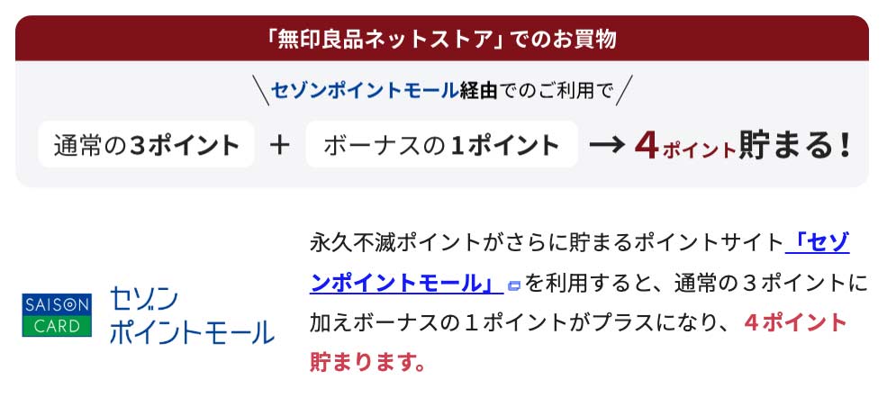 「セゾンポイントモール」を経由してから無印良品のネットストアでMUJIカードを使用した時、1,000円で永久不滅ポイントが4ポイント付与されます。