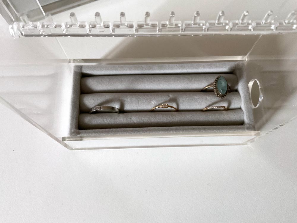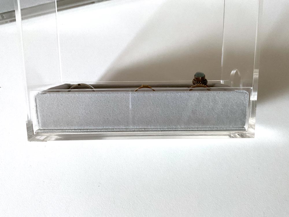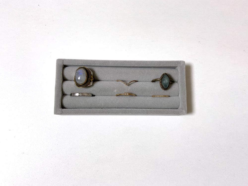 ですが、もちろん無印良品の「アクリルネックレス・ピアススタンド用ベロア内箱仕切・リング用・グレー」なら、専用の商品なのでもちろんサイズ感はピッタリです。