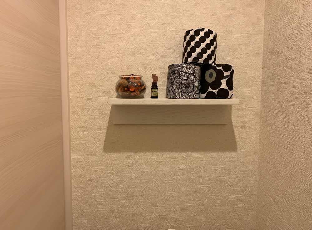 トイレットペーパーの収納はもちろん、ちょっとした物置きスペースにもなるので、ちょうどよい棚がなくても、生理用品などを置いておくこともできるようになって快適です。