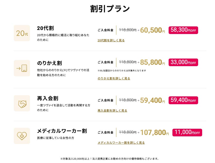もしあなたの会社や、利用している福利厚生サービスが「法人会員制度」の対象だった場合は、特別価格でツヴァイに入会できますよ。